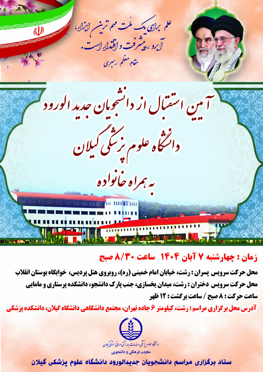 آیین استقبال از دانشجویان جدیدالورود نیمسال اول ۱۴۰۵-۱۴۰۴ دانشگاه علوم پزشکی گیلان، روز چهارشنبه ۷ آبانماه سال جاری با حضور خانوادهها و مسئولان دانشگاه در دانشکده پزشکی رشت برگزار میشود