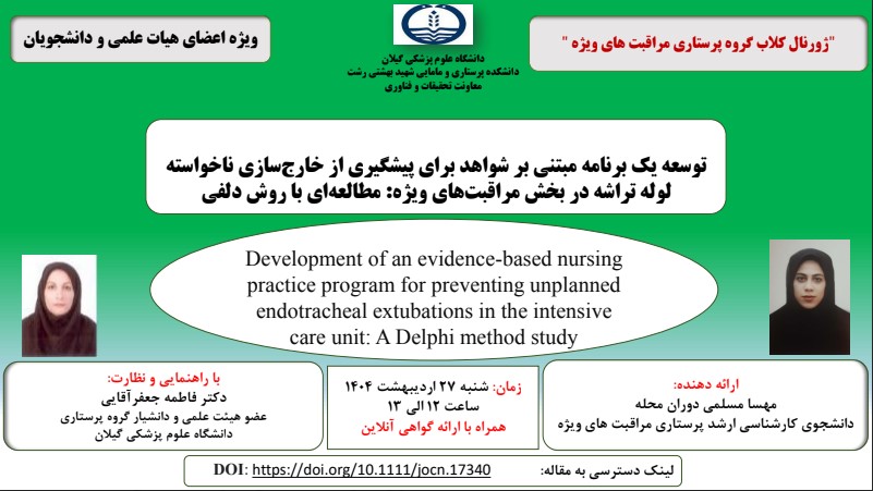از مجموعه ژورنال کلاب های پژوهشی معاونت تحقیقات و فناوری دانشکده پرستاری و مامایی شهید بهشتی رشت با سخنرانی مهسا مسلمی دوران محله دانشجوی کارشناسی ارشد پرستاری مراقبت های ویژه با راهنمایی و نظارت دکتر فاطمه جعفرآقایی عضو هیئت علمی و دانشیار گروه پرستاری  دانشگاه علوم پزشکی گیلان  به صورت حضوری برگزار می شود.