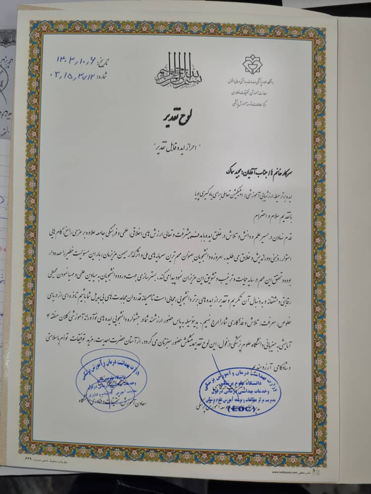 افتخار افرینی دانشجوی پرستاری دانشکده در جشنواره دانشجویی ایده های نوآورانه آموزشی مجید سماک دانشجوی پرستاری دانشکده پرستاری و مامایی شهید بهشتی رشت در جشنواره دانشجویی ایده های نوآورانه آموزشی کلان منطقه ۴ آمایش به میزبانی دانشگاه علوم پزشکی دزفول با ارائه ایده برتر حیطه ارزشیابی آموزشی با عنوان اپلیکیشن تعامل برای یادگیری پویا موفق به احراز عنوان ایده قابل تقدیر گردیده اند. رییس دانشکده با ارسال پیامی کسب این موفقیت را تبریک و برایشان آرزوی موفقیت نمودند.