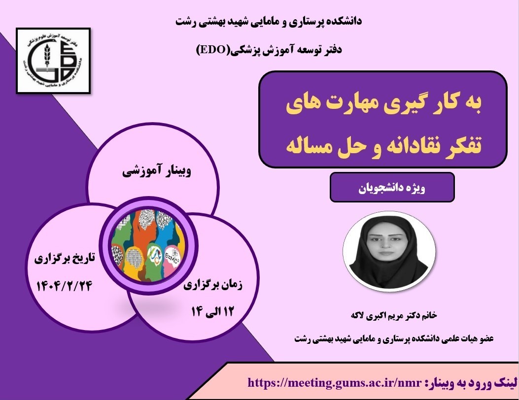 به اطلاع می رساند دفتر توسعه آموزش پزشکی(EDO) دانشکده پرستاری و مامایی شهید بهشتی در نظر دارد وبینار آموزشی ویژه دانشجویان، با موضوع: به کارگیری مهارت های تفکر نقادانه و حل مساله را با سخنرانی دکتر مریم اکبری لاکه عضو هیات علمی دانشکده، در ۲۴ اردیبهشت ماه از ساعت 12 الی 14 برگزار نماید.
