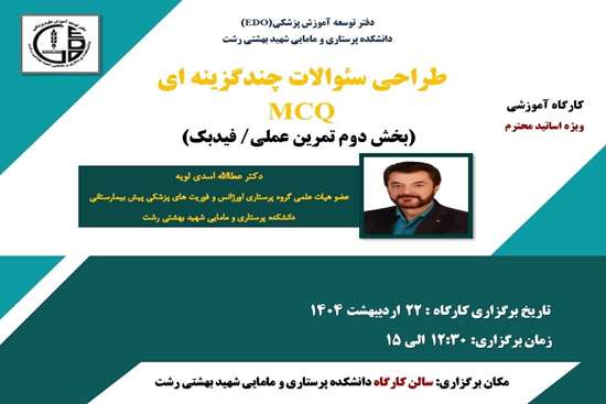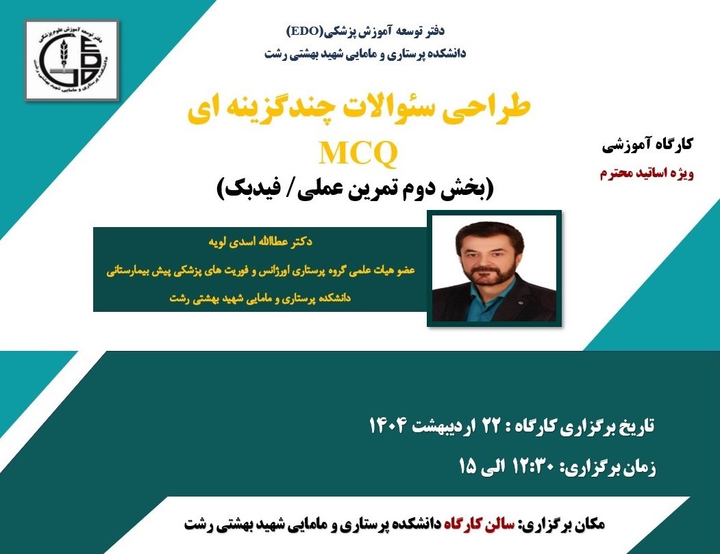 به اطلاع می رساند دفتر توسعه آموزش پزشکی(EDO) دانشکده در نظر دارد بخش دوم (تمرین عملی/ فیدبک) کارگاه توانمندسازی اساتید را با موضوع  طراحی سئوالات چندگزینه ای (MCQ) و با سخنرانی دکتر عطاالله اسدی لویه عضو هیات علمی گروه پرستاری اورژانس و فوریت های پزشکی پیش بیمارستانی دانشکده، در تاریخ 1404/2/22ساعت 12:30 الی 15 در سالن کارگاه دانشکده برگزار نماید.