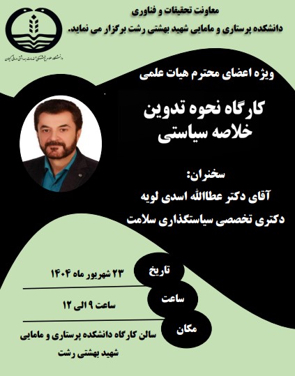 به اطلاع می رساند معاونت تحقیقات و فناوری دانشکده پرستاری و مامایی شهید بهشتی رشت در نظر دارد کارگاه حضوری با موضوع "نحوه تدوین خلاصه سیاستی" را جهت اعضای هیات علمی و اساتید دانشکده با سخنرانی دکتر عطاالله اسدی لویه در تاریخ 23 شهریور ماه 1404 از ساعت 9 الی 12 در سالن کارگاه دانشکده پرستاری و مامایی شهید بهشتی رشت برگزار نماید.