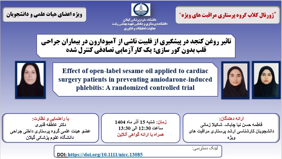 تاثیر روغن کنجد در پیشگیری از فلبیت ناشی از آمیودارون در بیماران جراحی قلب بدون کور سازی: یک کارآزمایی تصادفی کنترل شده