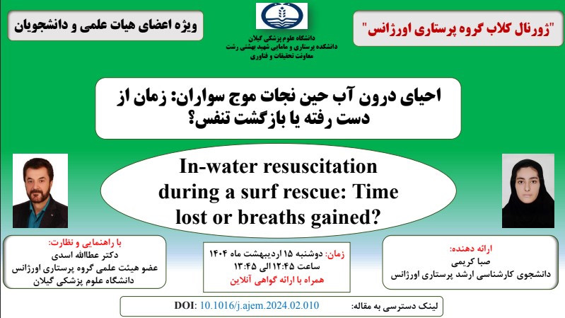 از مجموعه ژورنال کلاب های پژوهشی معاونت تحقیقات و فناوری دانشکده پرستاری و مامایی شهید بهشتی رشت با سخنرانی صبا کریمی دانشجوی کارشناسی ارشد پرستاری اورژانس با راهنمایی و نظارت دکتر عطاالله اسدی عضو هیئت علمی گروه پرستاری اورژانس دانشگاه علوم پزشکی گیلان به صورت حضوری برگزار می گردد.