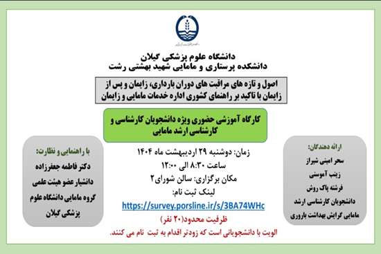 دوشنبه 29 اردیبهشت ماه از ساعت 8:30 الی 12، کارگاه آموزشی ویژه دانشجویان ترم 6 و عرصه کارشناسی مامایی و دانشجویان کارشناسی ارشد مامایی با راهنمایی و نظارت دکتر فاطمه جعفرزاده دانشیار عضو هیئت علمی گروه مامایی دانشگاه علوم پزشکی گیلان در سالن شورای2 دانشکده پرستاری و مامایی شهید بهشتی رشت برگزار می شود.