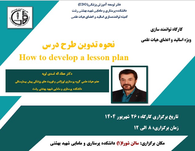 به اطلاع می رساند کمیته توانمندسازی اساتید دفتر توسعه آموزش پزشکی(EDO) دانشکده در نظر دارد کارگاه حضوری با موضوع "نحوه تدوین طرح درس" را جهت اعضای محترم هیات علمی و اساتید محترم دانشکده با سخنرانی دکتر عطاء اله اسدی لویه در تاریخ 26 شهریور ماه 1404 از ساعت 8 الی 12 در سالن شورا(1) دانشکده پرستاری و مامایی شهید بهشتی رشت برگزار نماید.