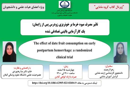 تاثیر مصرف میوه خرما بر خونریزی زودرس پس از زایمان: یک کارآزمایی بالینی تصادفی شده