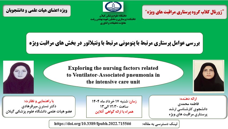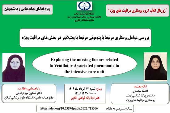 از مجموعه ژورنال کلاب های پژوهشی معاونت تحقیقات و فناوری دانشکده پرستاری و مامایی شهید بهشتی رشت با سخنرانی  فاطمه محمدی دانشجوی کارشناسی ارشد پرستاری مراقبت های ویژه و با راهنمایی و نظارت دکتر نسترن میرفرهادی عضو هیات علمی دانشگاه علوم پزشکی گیلان  به صورت حضوری برگزار می شود.