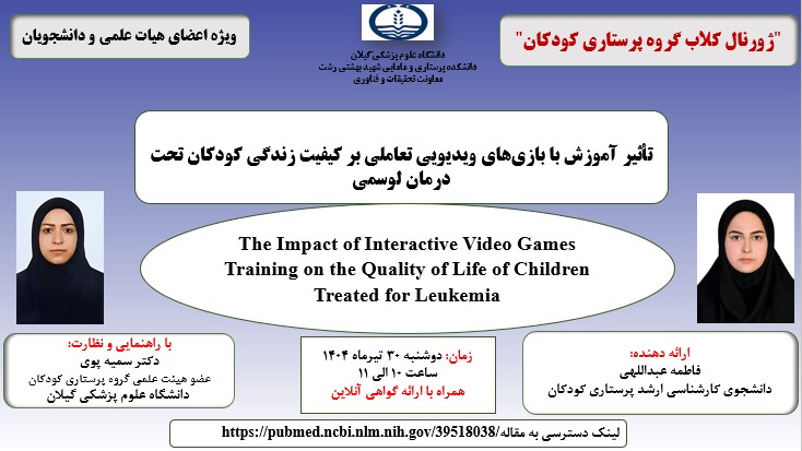 از مجموعه ژورنال کلاب های پژوهشی معاونت تحقیقات و فناوری دانشکده پرستاری و مامایی شهید بهشتی رشت با سخنرانی فاطمه عبداللهی دانشجوی کارشناسی ارشد پرستاری کودکان و با راهنمایی و نظارت دکتر سمیه پوی عضو هیئت علمی گروه پرستاری کودکان دانشگاه علوم پزشکی گیلان به صورت حضوری برگزار می شود.