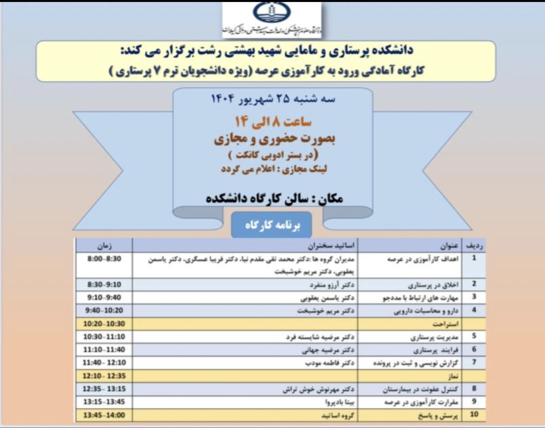 سه شنبه 25 شهریور ماه 1404 از ساعت 8 الی 14 کارگاه یک روزه حضوری و وبیناری آمادگی جهت ورود به کارآموزی عرصه (ویژه دانشجویان ترم 7 پرستاری)