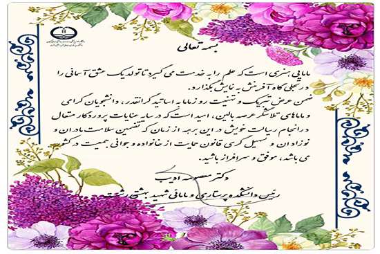ضمن عرض تبریک و تهنیت روز ماما به اساتید گرانقدر، دانشجویان گرامی و ماماهای تلاشگر عرصه بالین، امید است که در سایه عنایات پرودگار متعال در انجام رسالت خویش در این برهه از زمان که تضمین سلامت مادران و نوزادان و تسهیل گری قانون حمایت از خانواده و جوانی جمعیت در کشور میباشد، موفق و سرافراز باشید.