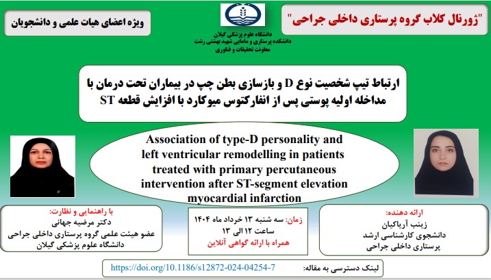 از مجموعه ژورنال کلاب های پژوهشی معاونت تحقیقات و فناوری دانشکده پرستاری و مامایی شهید بهشتی رشت با سخنرانی زینب آریاکیان دانشجوی کارشناسی ارشد پرستاری داخلی جراحی و با راهنمایی و نظارت دکتر مرضیه جهانی عضو هیئت علمی گروه پرستاری داخلی جراحی دانشگاه علوم پزشکی گیلان به صورت حضوری برگزار می شود.